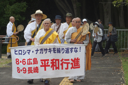 広島・長崎への平和行進に出発する日本山妙法寺の僧侶や市民=7月12日、東京・江東区、夢の島の第五福竜丸展示館で