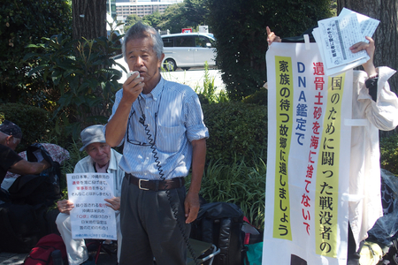 カーチス・ルメイの叙勲を取り消せと訴えるガマフヤーの具志堅隆松さん=8月15日、東京・九段の靖国神社前で