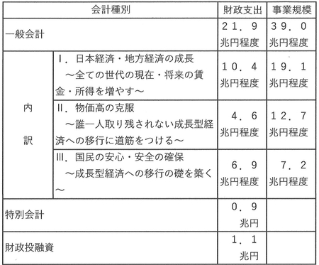 経済対策の規模は39兆円、うち一般会計から21兆9千億円、特別会計から9千億円、財政投融資から1兆1千億円支出するというもの。これに基づいて補正予算が組まれる。