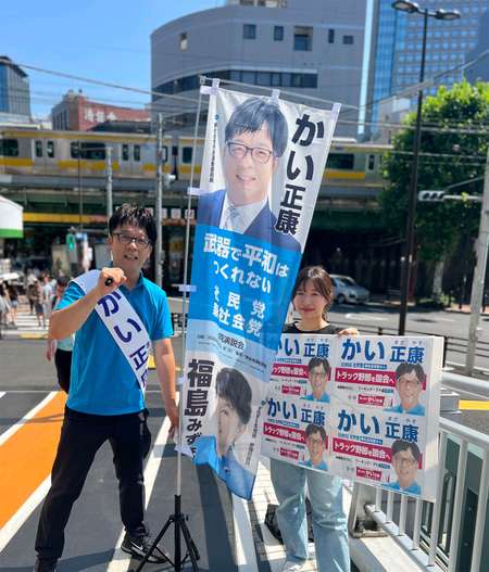 新社会党の岡﨑宏美委員長は、「かい正康さんの話は、22年間大型トラックの運転手として働いてきた労働者の生活の中からあふれ出る言葉となって仲間たちを元気づけている。政治は世襲や高学歴者が占める場ではない。女性や若者、障がい者、現場の労働者たちがそれぞれの課題を持ち込み、人としaて平和で豊かに生きるための制度・政策を練る場所だ。根っからの労働者、かい正康だからこそ、その場に必要だ。生きづらい社会を変えるため一緒に声を上げよう、たたかおう」と訴える。