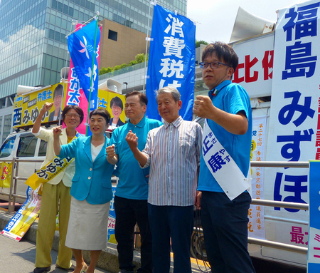 勝利へガッツポーズの右から、かい正康、花岡しげる、ラサール石井の各比例候補、福島瑞穂社民党党首、西ゆみか東京選挙区候補=7月3日、東京・新宿駅前