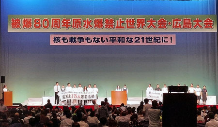 原水禁世界大会は、広島市の平和公園を出発した「折鶴平和行進」で幕を開け、2千人が参加して開かれた。 大会は被爆の実相を原点としたヒバクシャの援護・連帯を核廃絶運動、運動の次世代への継承を柱とし、核兵器禁止条約と核不拡散条約による核軍縮と、福島原発事故を教訓とした脱原発社会の実現をめざした。