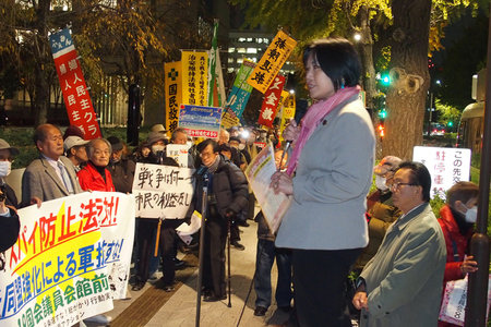 「戦争準備を進める政権は終わらせよう」と訴える沖縄選挙区選出の高良沙哉参院議員=11月19日、衆院議員会館前