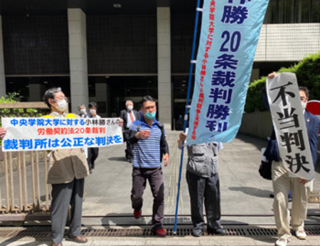この東京高裁判決はもともと4月に予定されていたものだが、新型コロナの影響で本日となった。この間、中央学院大学は学生の構内立ち入りを禁止し遠隔授業を実施、当支援する会の行動や労働組合の団体交渉も手控えざるをえなかった。それを良いことにして、大学側はこの判決公判に、弁護士も含め一人も列席しなかった。判決はわずか数秒で言い渡され、傍聴席からは怒りの声が挙がったことは言うまでもない。私たちはこの屈辱を忘れません。