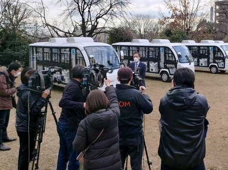 PCR検査の特別車の前で会見する保坂区長(2月4日)