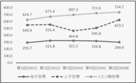 (図)母子世帯の年間収入(税込)平均値の推移(単位:万円)=独立行政法人 労働政策研究機構HPより