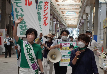 神戸市内の商店街で物価高騰問題を訴えるおかざき彩子さん
