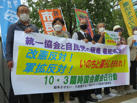 国会開会日行動には250 人が結集、旧統一教会解散・軍事大国阻止・生活不安解消へ自公政権と全力で闘うことを決意した=10月3日、国会前