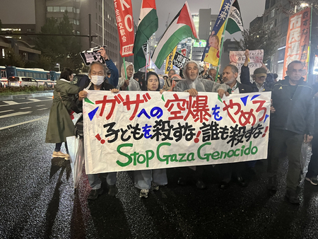多くの外国人と幅広い年代が参加した集会は、国連大学本部の一部敷地と、歩道に長く伸びる人々であふれ、1万人を超えるガザの犠牲者をこれ以上増やしてはならないという思いが凝縮された。