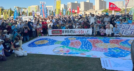 政権が有事を煽り、急速に戦争体制を準備する南西諸島の基地化に抗し、「平和な島に戻せ、再び戦場にしてはならない」と11月23日、那覇市をはじめ東京、名古屋、大阪などで大規模な平和集会が開かれた。新社会党の宮川敏一副書記長が代表参加した那覇市の奥おうのやま武山公園陸上競技場と、国会正門前集会から報告する。