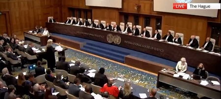 国際司法裁判所で審理始まる=1月9日、オランダ・ハーグ、英・SKY newsから