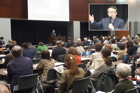「種子を守る!緊急院内集会」で講演する鈴木宣弘・東大大学院特任教授(右上)=4月4日、参院議員会館