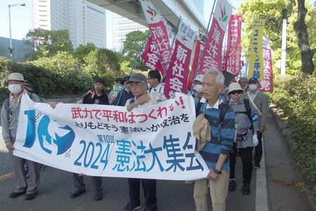 憲法施行77年の5月3日、憲法大集会が東京・有明防災公園で3万2千人が参加して開かれた。戦争法を許すなと、15年に党派を超えて開催した憲法集会は10年を迎えたが、憲法9条が否定され、先制攻撃も辞さない国へと暴走する自公政権に抗議、憲法を守らせる決意を固めた。