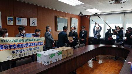各区のカジノの是非を決める会はこの日、区選管の担当者に「横浜市条例制定請求書」をダンボール2103箱に詰めた署名簿ととともに提出した。選管は今後、選挙人名簿と照らし合わせて有効性を確認、12月3日までに有効数を発表する。発表後は約1週間、名簿を公開して異議申し立てを受け付ける。